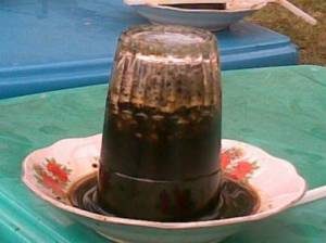 Kopi item yg cara minumnya diseruput dari piring kecil dg gelas kopi terbalik di atasnya. Hasilnya memang suedep tenan. Sari2 kopinya bisa terseruput scr mantap dan optimal.